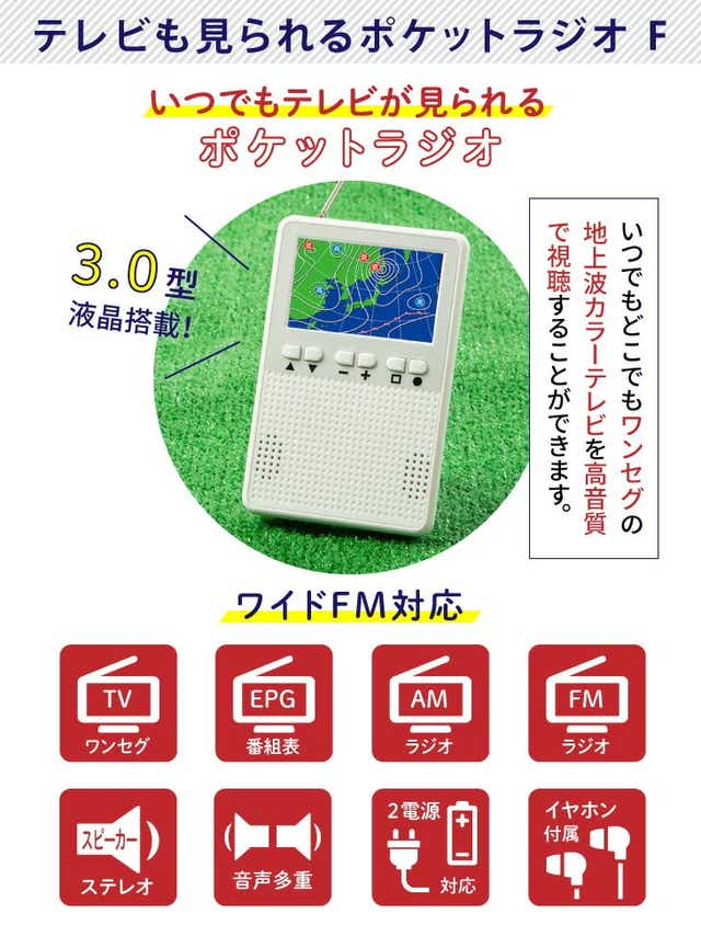 Panasonic RFND50TV 特徴的な「ワンタッチ集音」機能は、 ラジオがそのまま集音マイクになる おもしろい機能。 会話・テレビ・おけいこの3モードで周囲の音を聞きとりやすくすることができTV・ラジオを外出先でいつでも観れる便利なコンパクトテレビラジオです。 選局はボタンを押すだけのオート選局。 テレビの字幕放送や音声多重放送に対応。 番組表も見られて便利です。 電源は